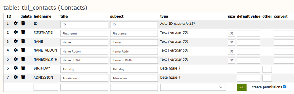 However, we want to start small, so we leave it with this simple table right now. It contains only simple field types such as text or date. Later on, we get to some more advanced field types that are supported by Limbas.