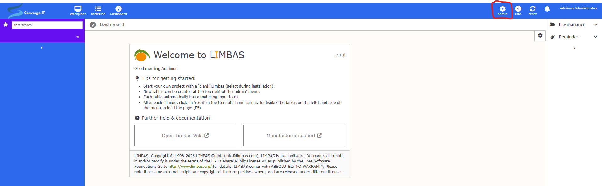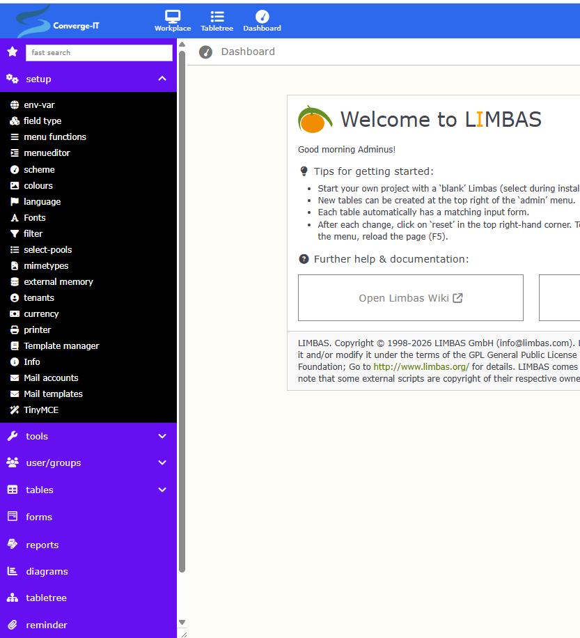 When we start Limbas after a fresh install, we see a quite empty page.