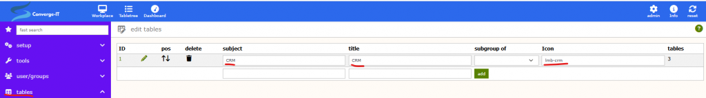 Click on the ‚table‘ menue item and provide a tbalegroup name such as ‚CRM‘. here are a couple of predefined icons shipped with Limbas, so I choose ‚lmb-crm‘ as the icon representing may CRM app going forward.