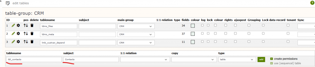 Now click on your CRM table-group and add your first table. It is good practice to give a physical table name (as it appears in the postgreSQL database) and a subject which means the name of the table your users will see.