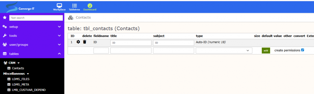 After creating the table ‚Contacts‘ and assigning it to the table-group ‚CRM‘ you can see the result in the left hand side admin menue after login/logout as admin user. You can also see that I created a table group ‚Miscellaneous‘ where I moved the Limbas syste tables into. They have no relevance for us right now.