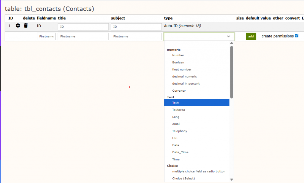 While our first table has been created, we are now able to add all the fields we would like to manage as contacts data to the table. We start with the firstname. With ‚fieldname‘, ‚title‘ and ’subject‘ we have in total three identifiers for a field. Fieldname is the physical field name in the database. Title represents how this table is identified within Limbas and subject is what the user sees as name of the field. The field type can be selected out o a huge range predefined field types. Within Limbas it is possible to generate own field types, but this is not what we want to do right now. When designing the Contacts table we will learn a lot of useful predefined field types. For our first field ‚Firstname‘, we select ‚text‘ as appropriate field type.